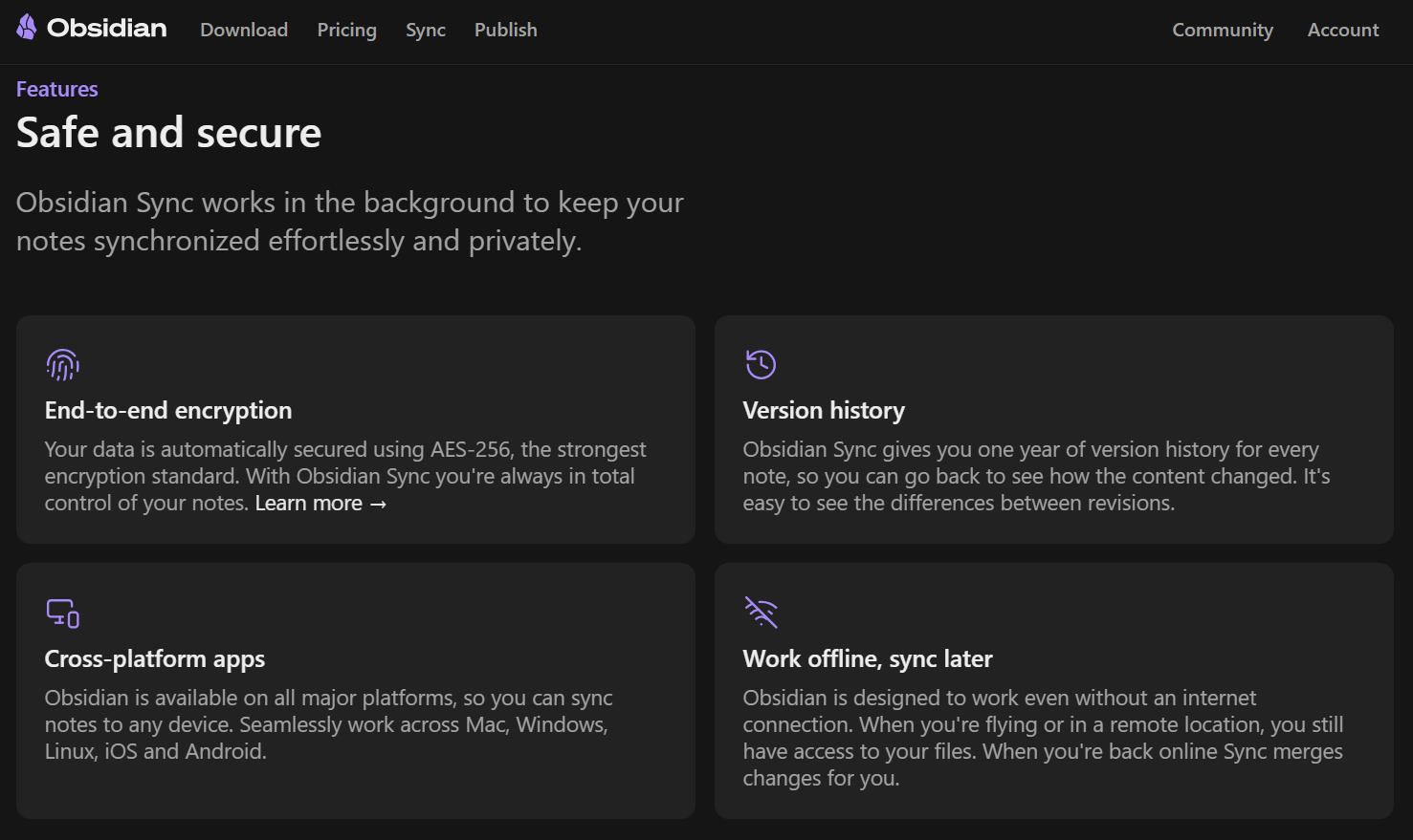 Elle prend en charge la synchronisation en temps réel de vos vaults (répertoires de notes), y compris les images et les paramètres de configuration. Obsidian Sync se distingue par sa capacité à gérer les conflits de version et te permet de récupérer des versions ultérieures de tes fichiers.