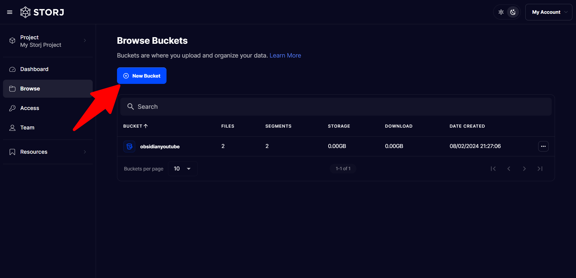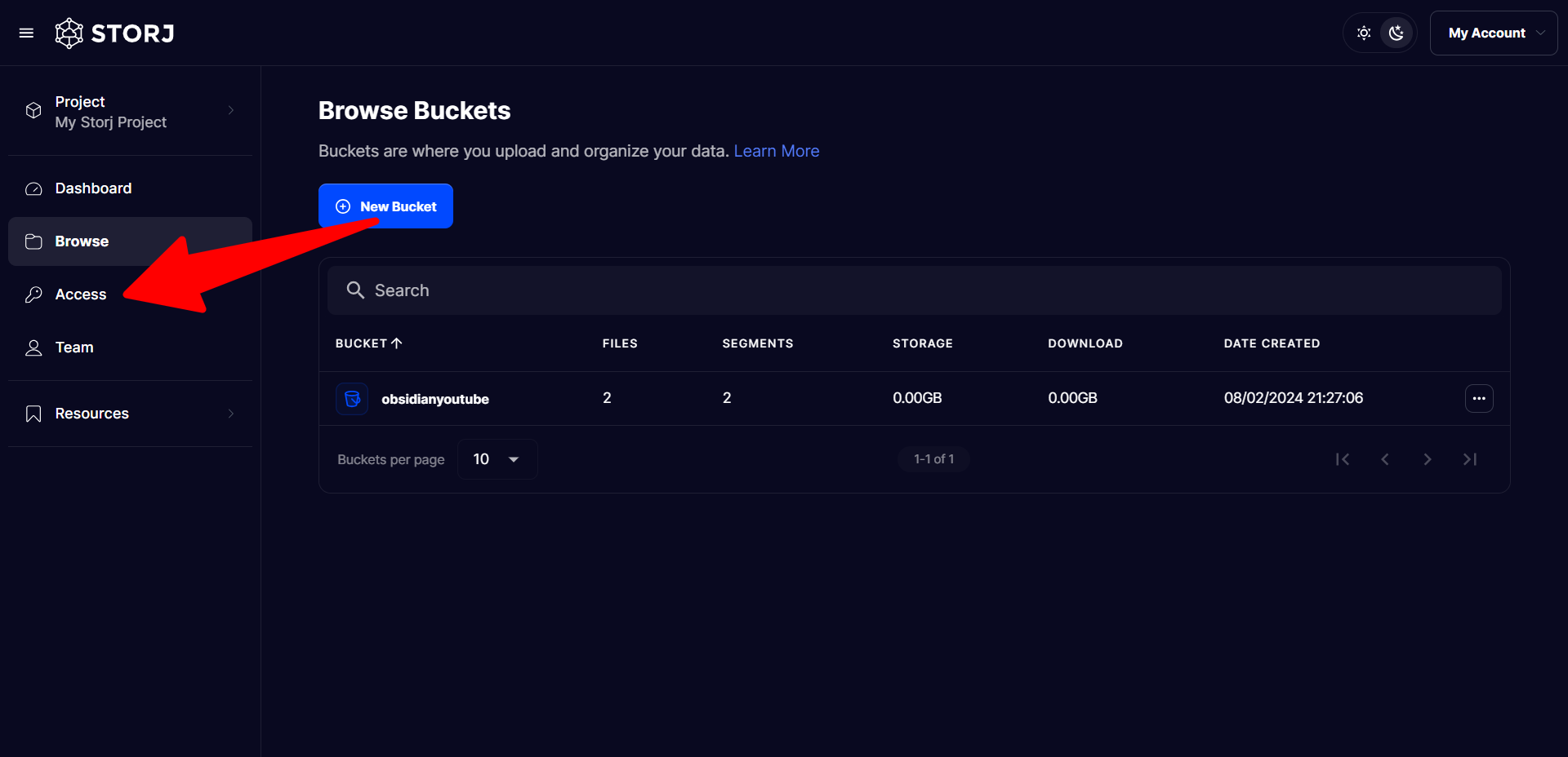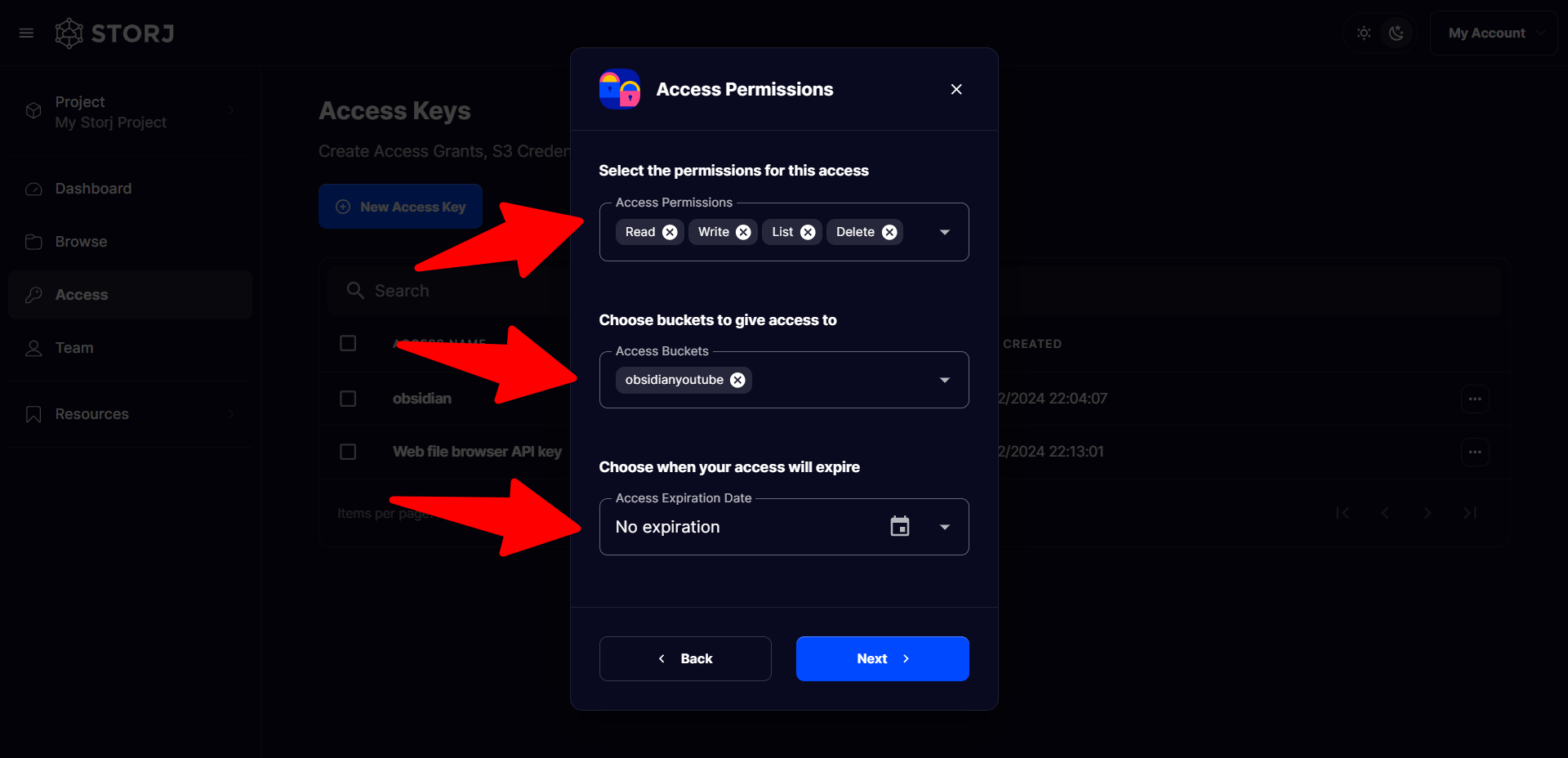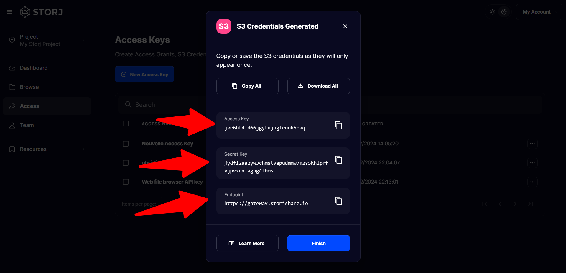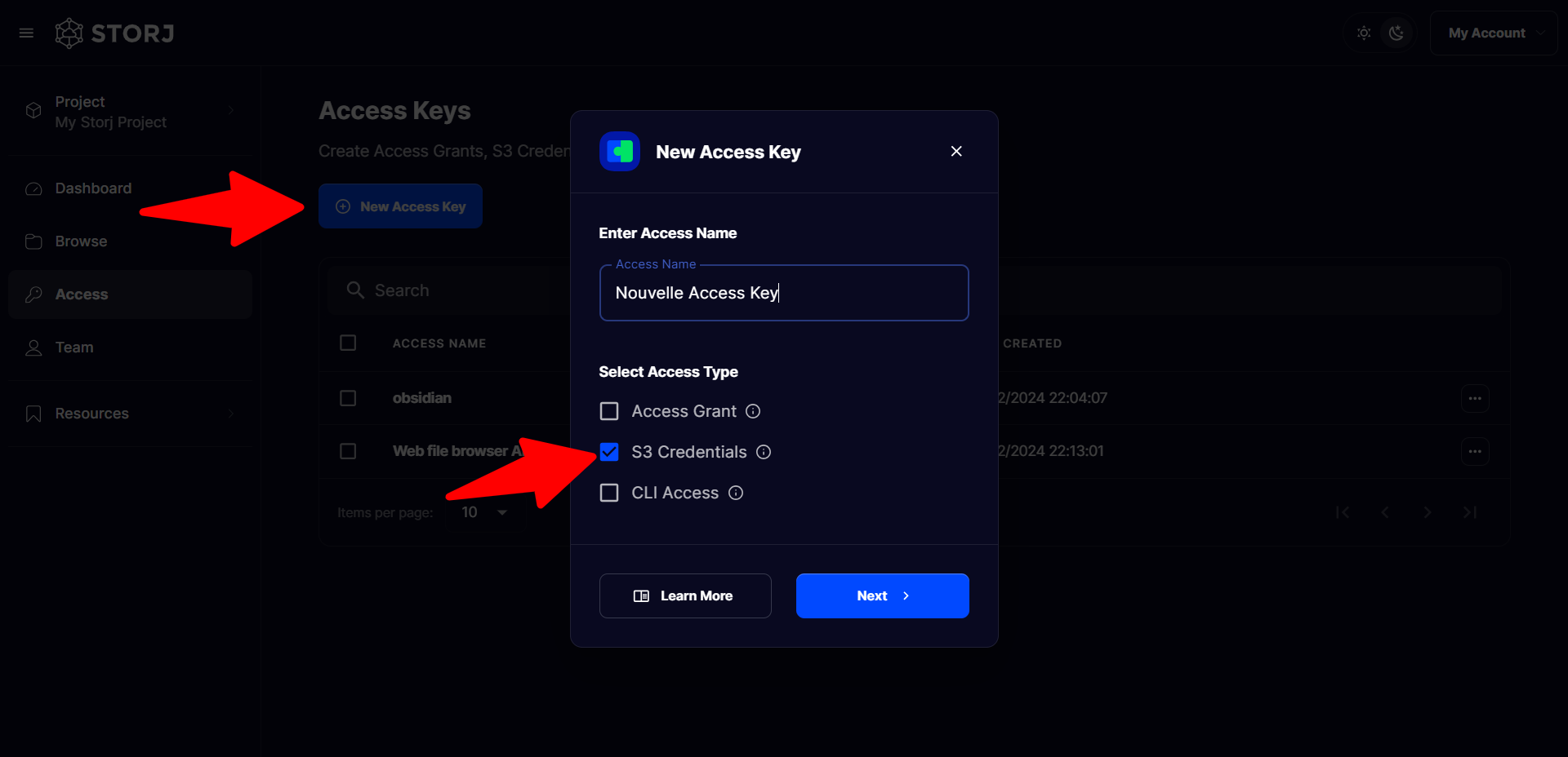 - Créer des Access Key (Clés d'Accès) afin que Remotely Save puisse te connecter à ton bucket : Retourne à ton dashboard Storj pour créer des clés d'accès spécifiques à ton bucket de type S3