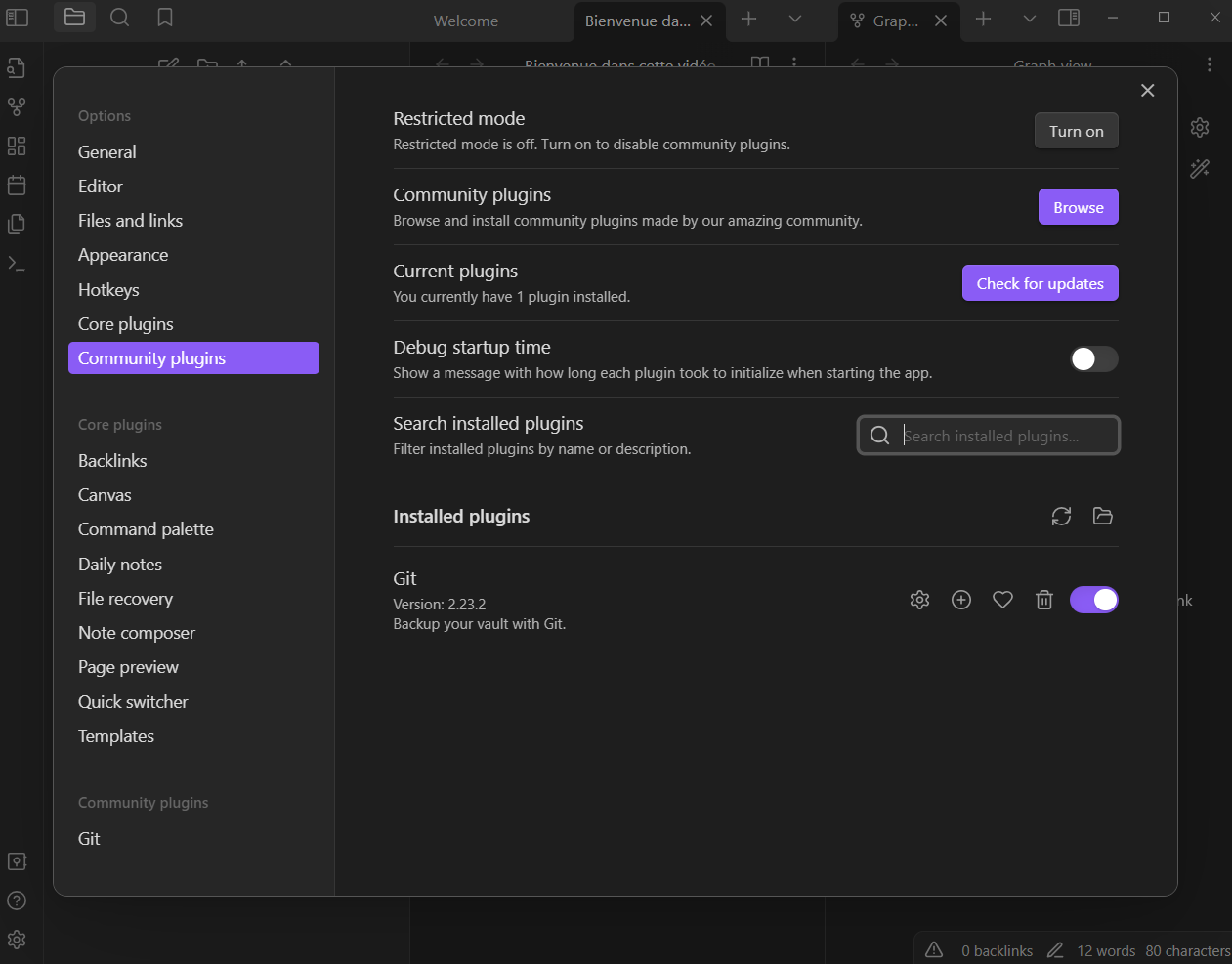 - Le plugin Git d'Obsidian, qui facilite la sauvegarde et le suivi des versions de vos notes. Cependant, préparez-vous à une certaine complexité technique. L’avantage c’est que tu n’auras qu’à installer ce plugin sur tous tes appareils (pc, ordi, téléphone,) via Obsidian la synchronisation sera fait.