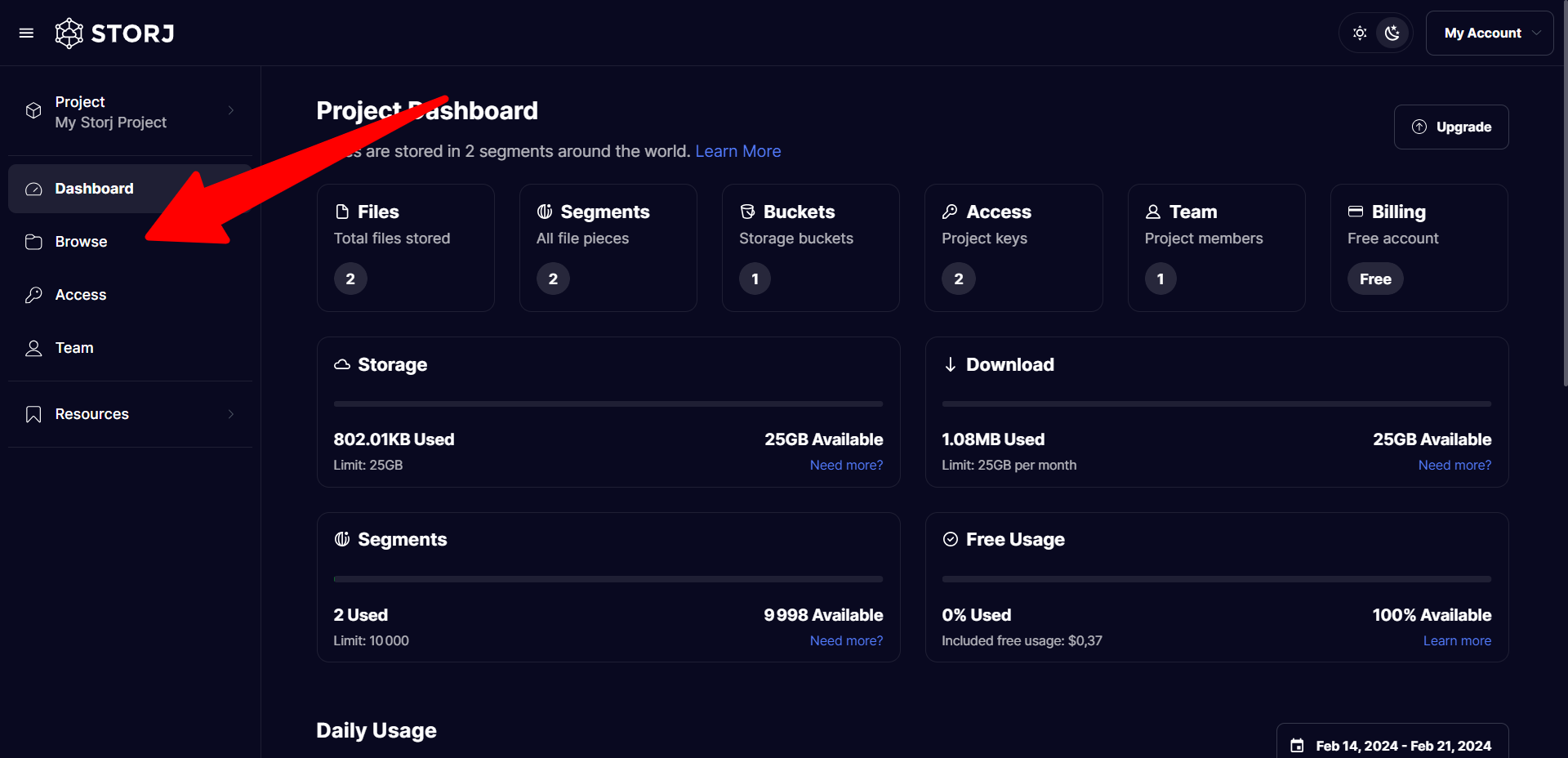 - Accès au Dashboard Storj : Une fois connecté, utilise le projet par défaut ou crée un nouveau